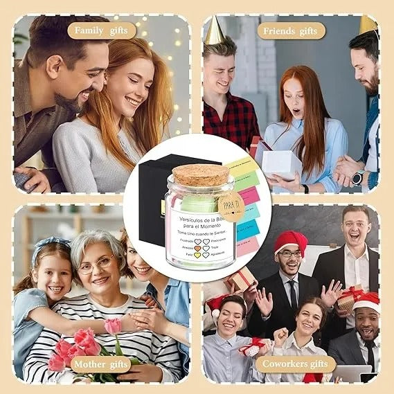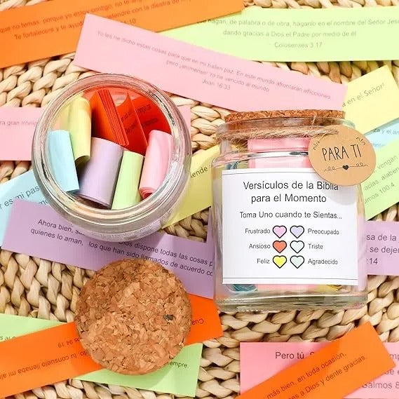 PERFECTO PARA ESTUDIO DE LA SAGRADA BIBLIA Nuestro Tarro de Versículos Bíblicos; es una excelente herramienta que facilita el estudio de versos bíblicos, cada verso fue seleccionado para cada emoción o sentimiento facilitando momentos de estudio y reflexión.