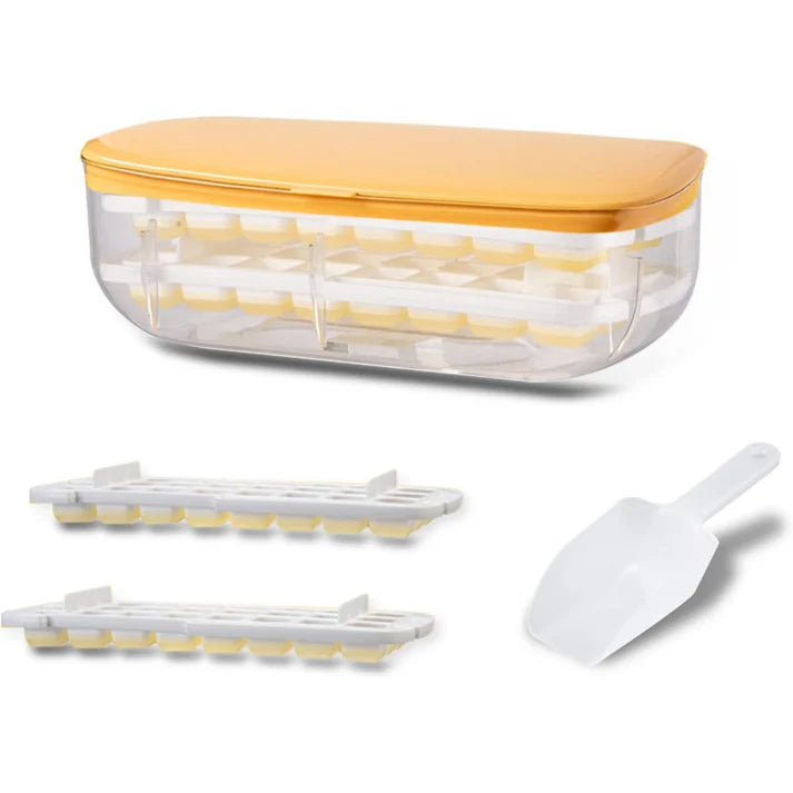 - Incluye: 2 bandejas de hielo para 80 cubos, tapadera, recipiente y utensilio para servir.